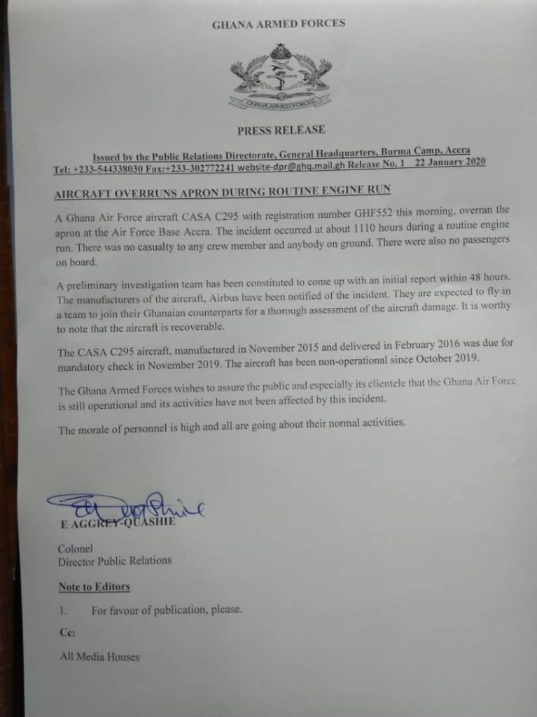 The aircraft, CASA C295 with registration number GHF552 overrun the apron during a routine engine run at about 11:10 hours on Wednesday [January 22, 2020], a press statement signed and issued by the Director of Public Relations of the Ghana Armed Forces, Colonel Eric Aggrey-Quashie said.