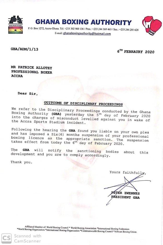 The Ghana Boxing Authority has suspended Ghanaian boxer Patrick Allotey for 6 months for misconduct after he was seen in a video punching a Kotoko fan.