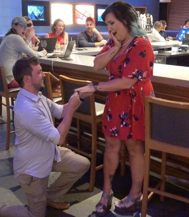 Carroll got down on one knee and pretended to ask for Corinne’s hand in marriage. Other customers were so excited about witnessing the special moment they started giving the couple free shots.