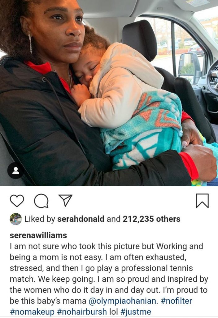 The professional tennis player wrote: “I am not sure who took this picture but Working and being a mom is not easy. I am often exhausted, stressed, and then I go play a professional tennis match. We keep going. I am so proud and inspired by the women who do it day in and day out. I’m proud to be this baby’s mama @olympiaohanian. #nofilter#nomakeup #nohairbursh lol #justme.”