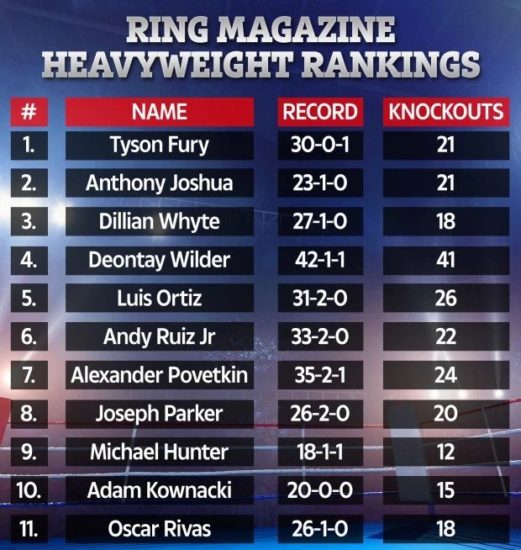 Boxing’s biggest magazine, the Ring Magazine, on Tuesday released it’s new list of top heavyweight boxers, with Deontay Wilder dropping down the list while British-Nigerian boxer Anthony Joshua climbed up the list.