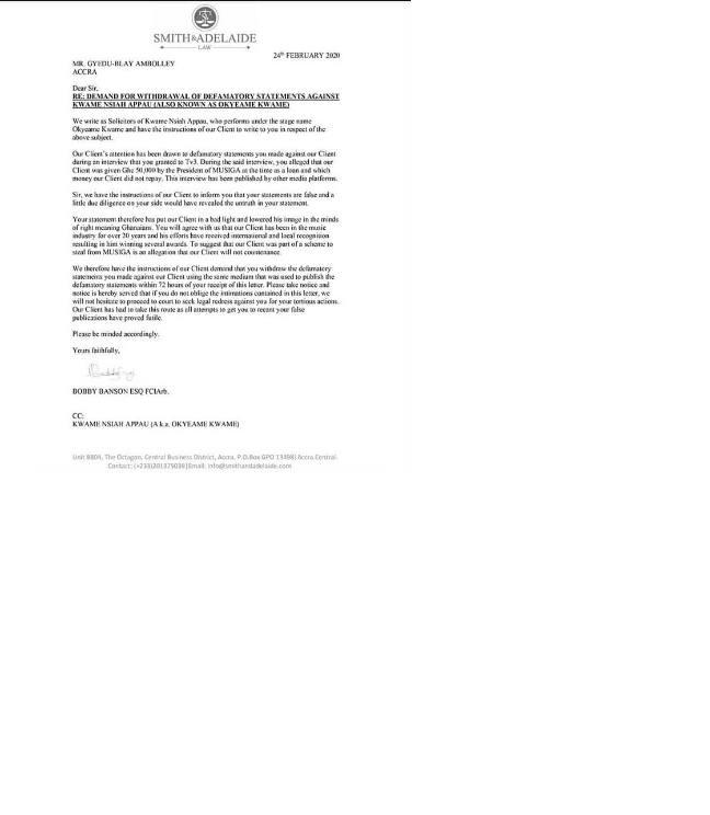 Okyeame Kwame, who took to his social media handles to put out the letter addressed to Ambolley, said the statement was false and a dent on his hard-earned reputation.