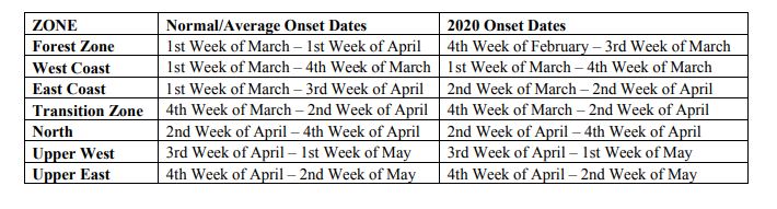 The Upper West will have the rainy season starting between the third week of April and the first week of May while the Upper East area will be the last in the country to get into the rainy season.