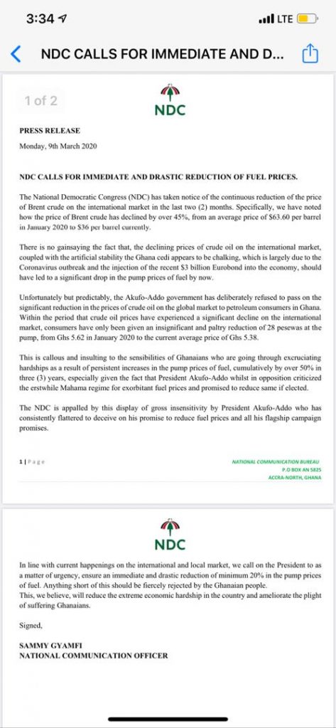 Ghana, according to the party, is expected to witness a decline in fuel prices as a result of Coronavirus outbreak which has paved way for artificial stability of the economy and a $3 billion Eurobond pledge to Ghana; but that is far from reality.