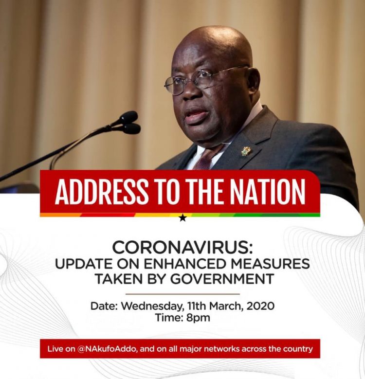 President Nana Addo Dankwa Akufo-Addo will later this evening [Wednesday] address the nation on the novel coronavirus which is fast spreading to most countries in the world.
