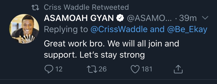 Few minutes after Waddle made the post, Ghana’s top striker Asamoah Gyan replied that, they will all join and support the great work he is doing.