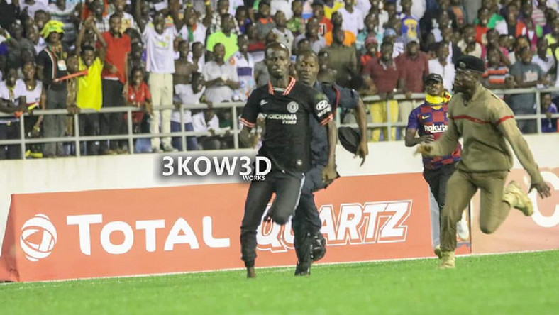 A football fan during the latter stages of the Black Stars’ win over South Africa in the 2021 AFCON qualifiers at the Cape Coast Stadium on November 14, 2019 ran onto the pitch and halted play for some few minutes.