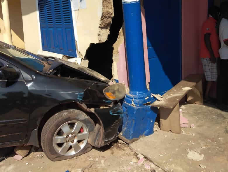 The impact, according to the police, forced the Toyota Corolla with registration number, GE 4883-18 to ram into the police station building.