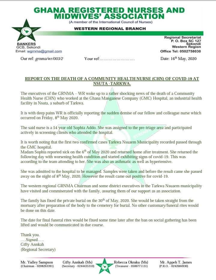 A nurse with the Ghana Manganese Company (GMC) Hospital at Nsuta in Western Region has succumbed to the novel Coronavirus disease.