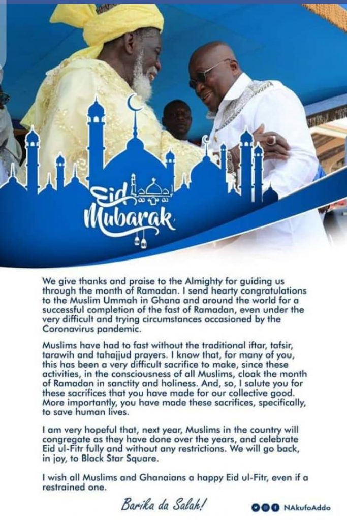 President Nana Addo expressed the hope that next year, Muslims in the country will “congregate as they have done over the years, and celebrate Eid ul-Fitr fully and without any restrictions.”