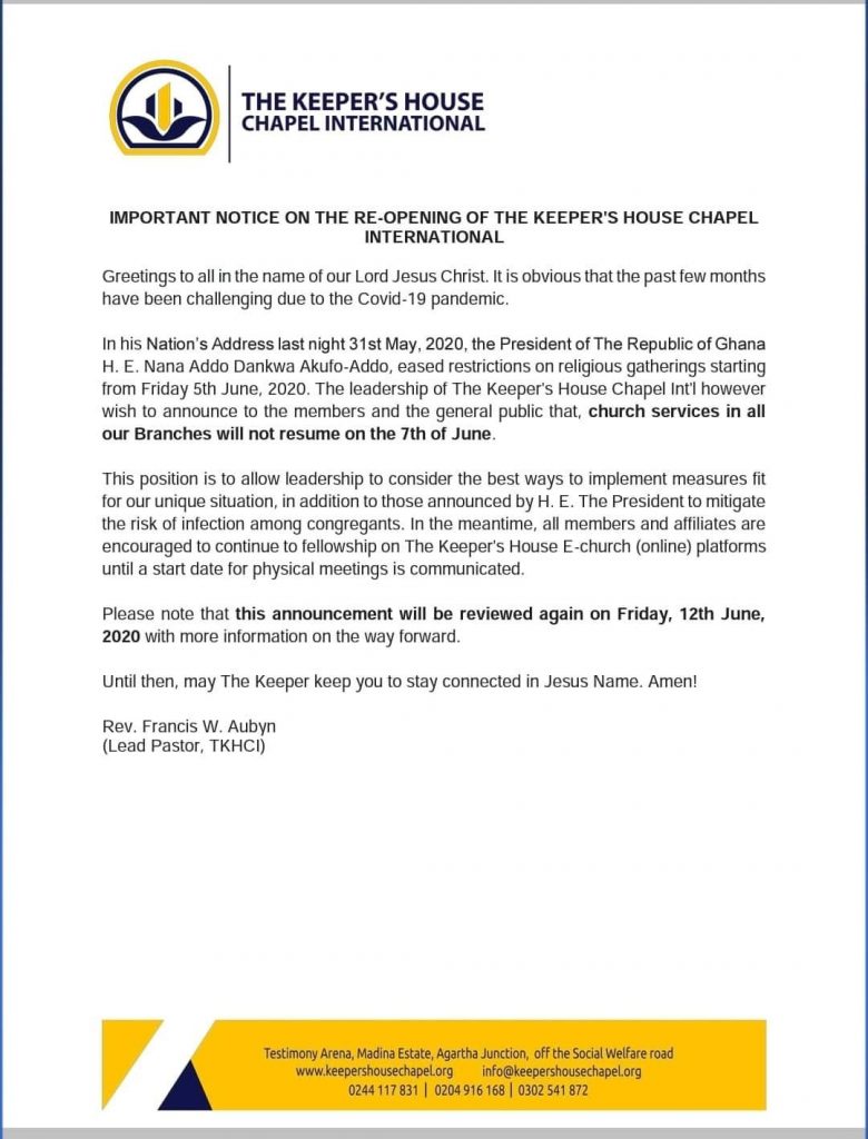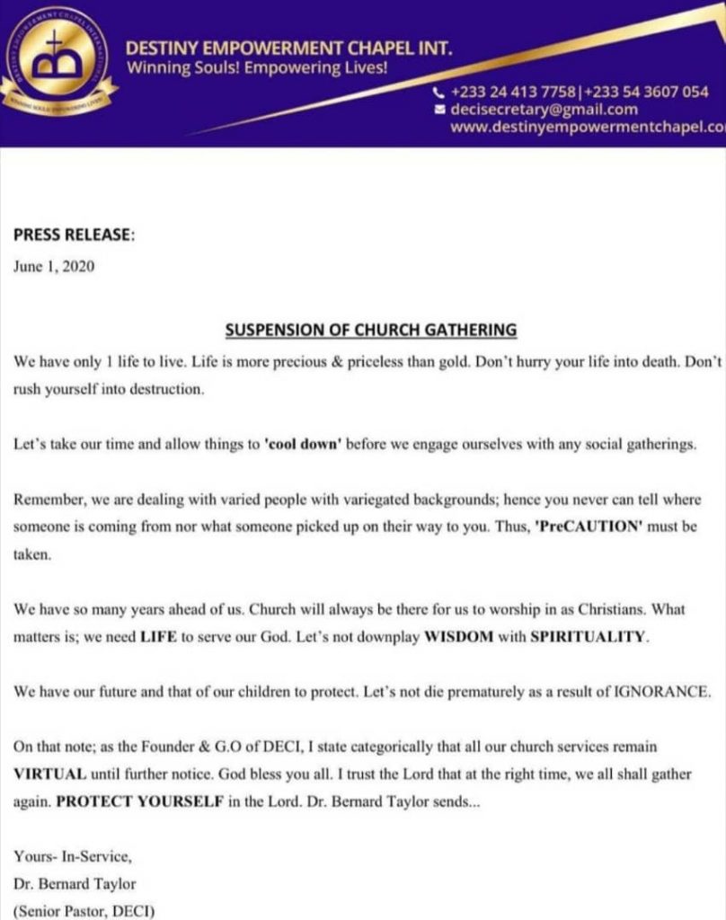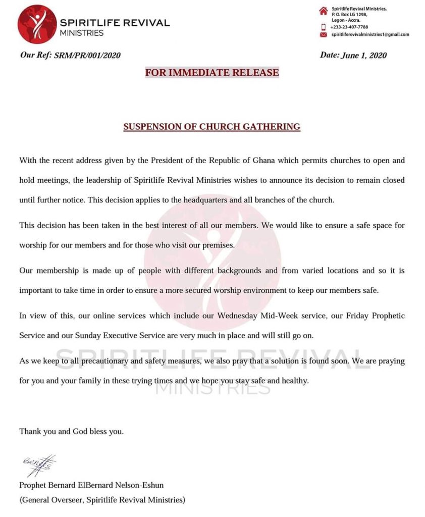 The Spiritlife Revival Ministries, headed by Prophet ElBernard Nelson-Eshun, also indicated that the “decision had been taken in the best interest of all our members. We would like to ensure a safe space for worship for our members and for those who visit our premises.”