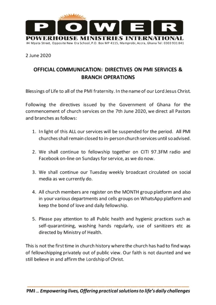 Power House Ministries International in a statement also stated that: “All our services will be suspended for the period. All PMI churches shall remain closed to in-person church services until so advised. We shall continue to fellowship together on Citi 97.3FM and Facebook on-line on Sundays for service, as we do now. We shall continue our Tuesday weekly broadcast circulated on social media as we currently do.”