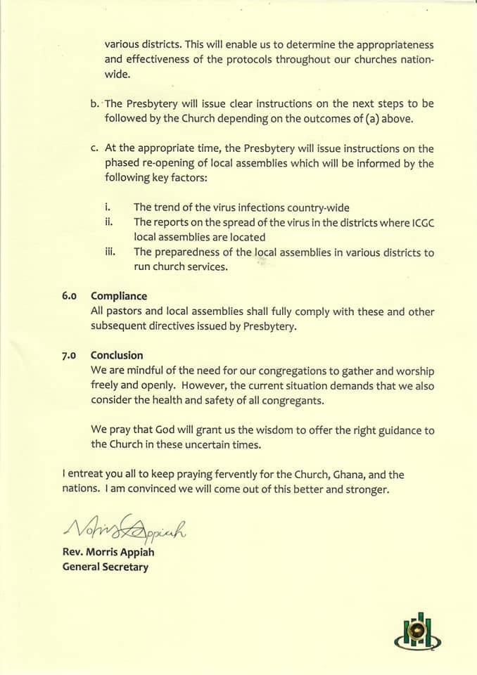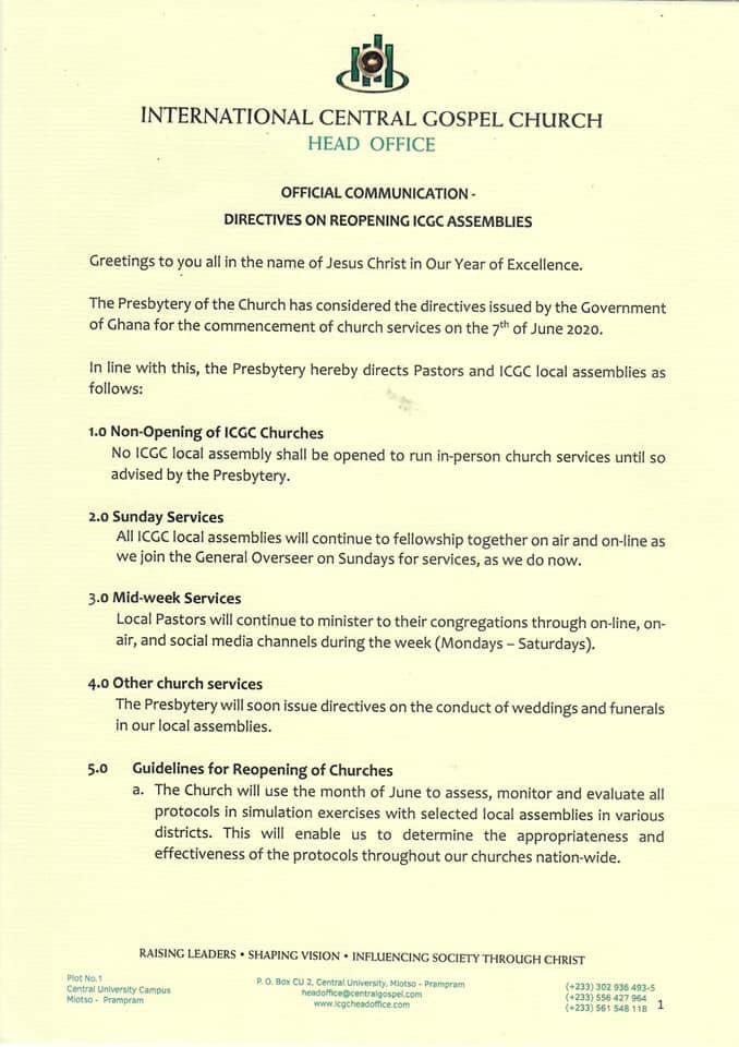 ICGC, however, assured that it “will use the month of June to assess, monitor and evaluate all protocols in simulation exercises with selected local assemblies in various districts as this will enable us to determine the appropriateness and effectiveness of the protocols throughout our churches nationwide.”