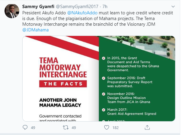 “President Akufo-Addo must learn to give credit where credit is due. Enough of the plagiarisation of Mahama projects. The Tema Motorway Interchange remains the brainchild of the Visionary John Dramani Mahama,” he argued in the tweet.