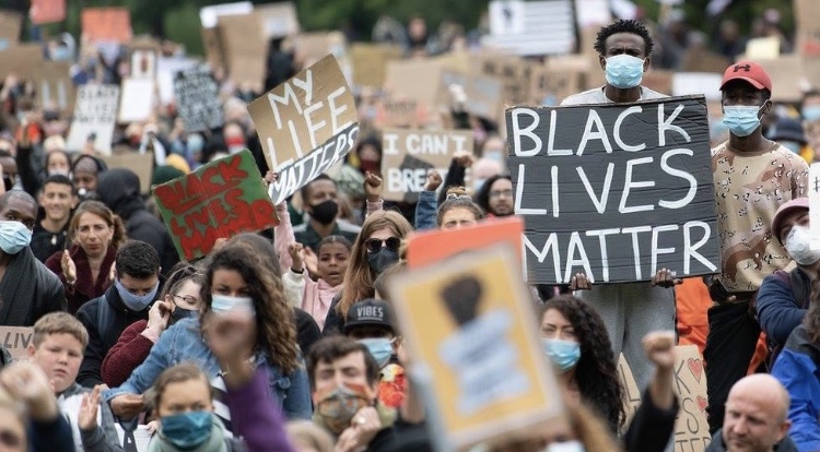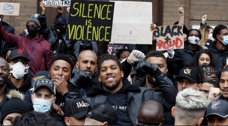 At a protest in his hometown of Watford, Britain’s world heavyweight champion boxer Anthony Joshua told the crowds: “We can no longer sit back and remain silent on this senseless, unlawful killing and sly racism on another human being.”
