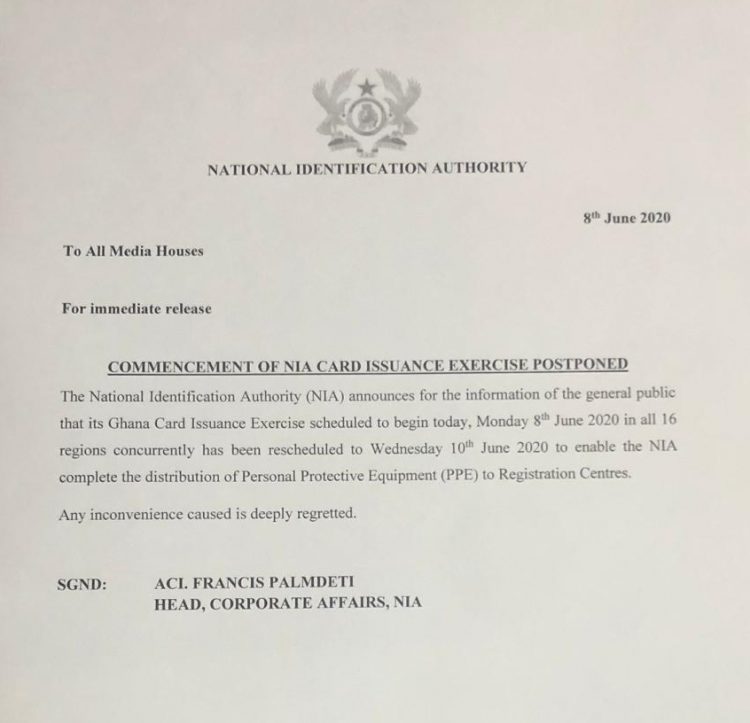 The National Identification Authority (NIA) has rescheduled its issuance of the printed Ghana Cards from today [Monday] to Wednesday, June 10.