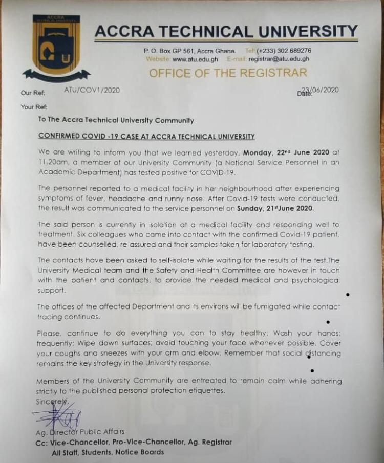 A National Service Person at the Academic Department of the Accra Technical University has tested positive for Coronavirus.