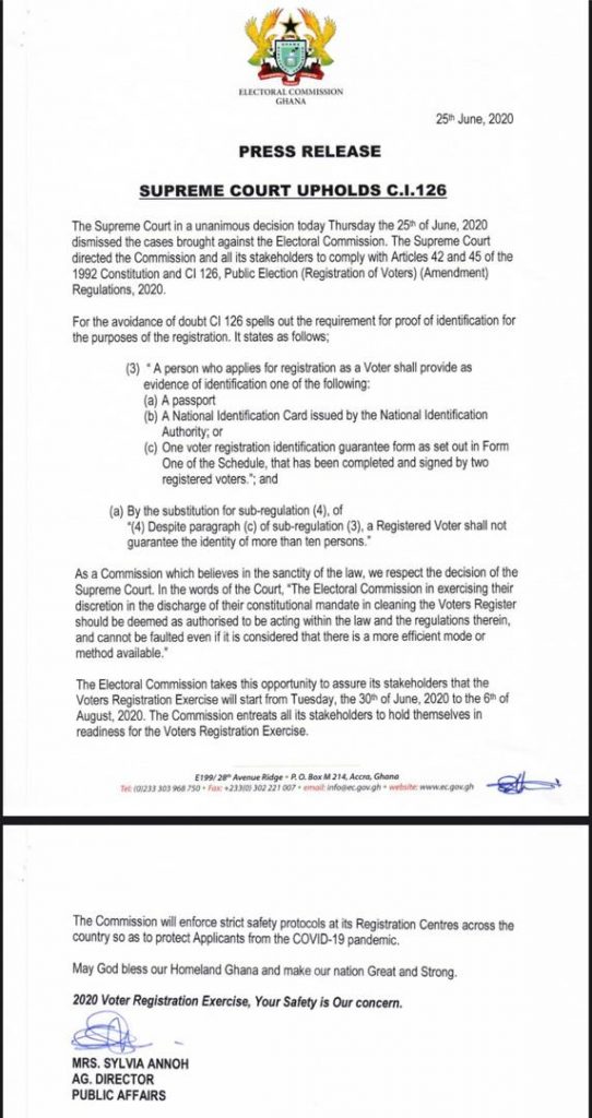 The electoral management body made the announcement in a statement on the back of the clearance it received from the Supreme Court today, June 25, 2020, for the registration exercise to proceed unabated.