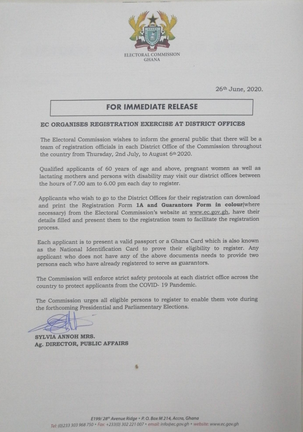 “Applicants who wish to go to the district offices for their registration can download and print the Registration Form 1A and Guarantors Form in colour (where necessary) from the Electoral Commission’s website at www.ec.gov.gh, have their details filled and present them to the registration team to facilitate the registration process.”