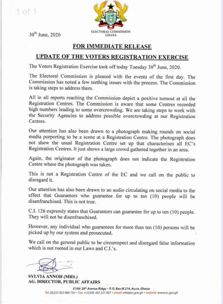 “Our attention has also been drawn to a photograph making rounds on social media purporting to be a scene at the registration centre. The photograph does not show the usual registration centre set up that characterises all EC’s registration centres. It just shows a large crowd gathered together in an area.”