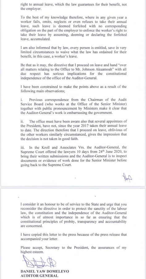 The Auditor-General, Daniel Domelevo, has written a letter to the Presidency urging President Akufo-Addo to reconsider the directive to proceed on his accumulated leave.