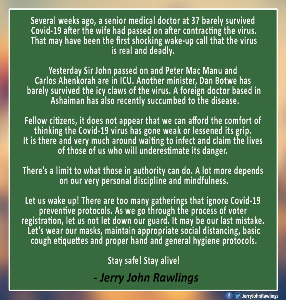 “Yesterday Sir John passed on and Peter Mac Manu and Carlos Ahenkorah are in ICU. Another Minister, Dan Botwe has barely survived the icy claws of the virus. A foreign doctor based in Ashaiman, has also recently succumbed, to the disease,” Mr. Rawlings noted.