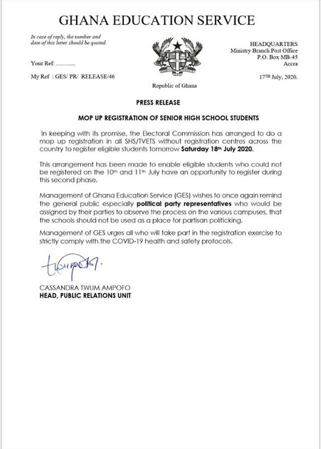 The Electoral Commission (EC) is expected to organise a mop-up registration in all Senior High Schools (SHSs) without registration centres across the country on Saturday, July 18, 2020.