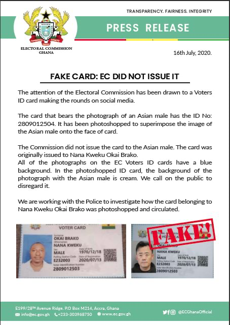 According to the EC, the image of the said ID card that has gone viral on social media is fake and an alteration of an original card duly issued to a Ghanaian male.