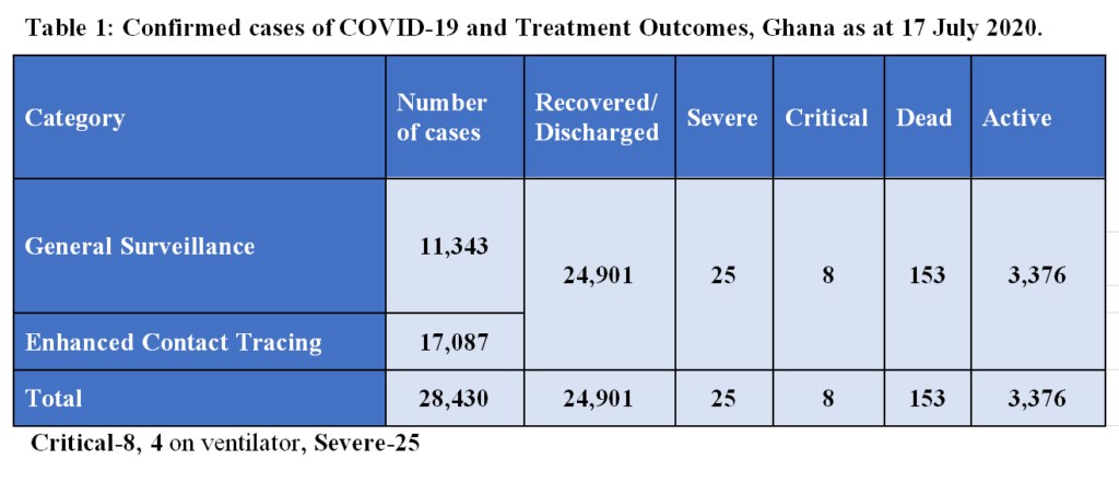 The total number of COVID-19 infections recorded in Ghana has increased to 28, 430 following the verification of 763 new cases on Monday, July 20, 2020.