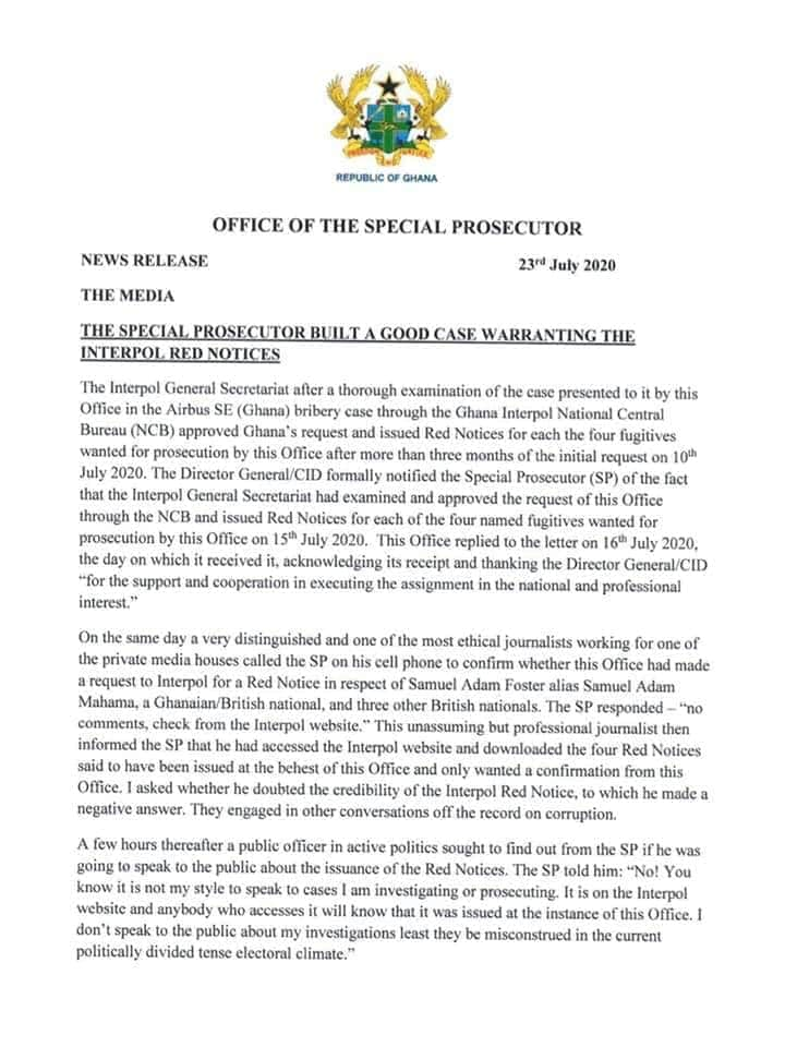 “The SP wishes to inform Ghanaians that his Office has conducted an independent investigation and gathered credible evidence for the steps it has taken so far, and will continue to take in the gluttonous Airbus SE (Ghana) bribery case.”