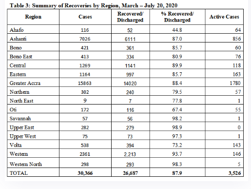 The Greater Accra Region still tops the chart with 15, 863 active cases Out of this number, 1, 078 are active cases following the recovery /discharge of 14, 020 persons.