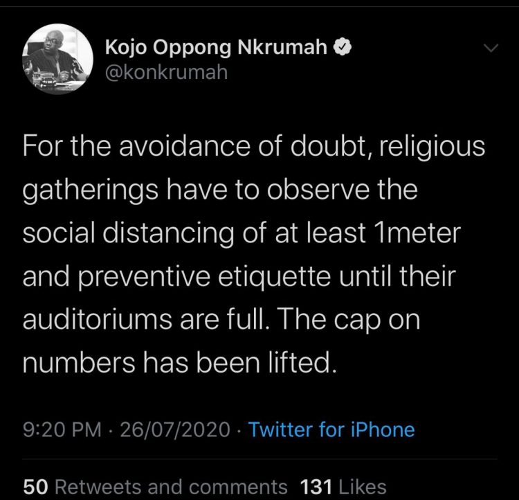 The Minister of Information, Oppong Nkrumah in a subsequent tweet clarified that: “For the avoidance of doubt, religious gatherings have to observe the social distancing of at least 1meter and preventive etiquette until their auditoriums are full. The cap on numbers has been lifted”.