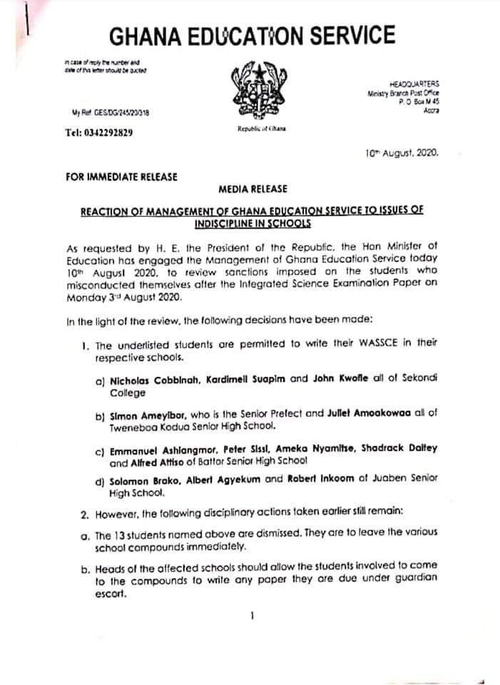 “The Minister had a meeting with the management of GES today [August 10, 2020] to review the sanctions imposed on the students who misconducted themselves and we decided that now, the students will be allowed to write the WASSCE in their respective schools,” Mrs. Ampofo said.