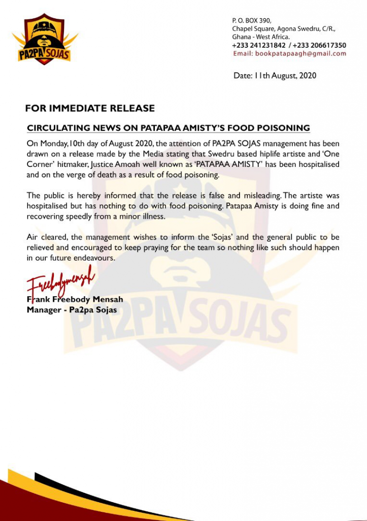 “On Monday, 10th day of August 2020, the attention of PA2PA SOJAS management has been drawn on a release made by the Media stating that Swedru based hiplife artiste and ‘One Corner’ hitmaker, Justice Amoah well known as ‘PATAPAA AMISTY’ has been hospitalised and on the verge of death as a result of food poisoning,” the release said.