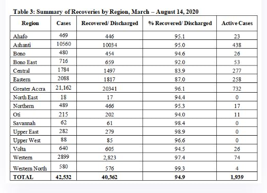 The last update from the Ghana Health Service (GHS) on Saturday, August 15, 2020, indicated that 147 new cases that pushed the total number of confirmed cases to 42,210.