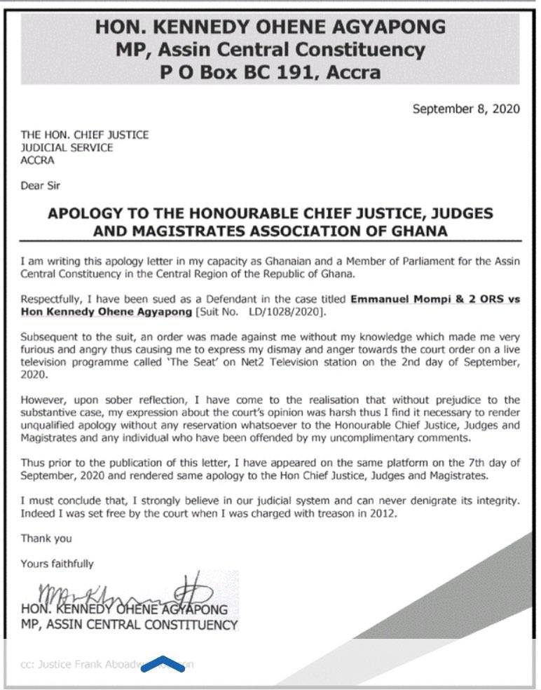 Assin Central MP, Kennedy Agyapong, has rendered an unqualified apology to the Chief Justice, Kwasi Anin-Yeboah, judges and magistrates in the country.