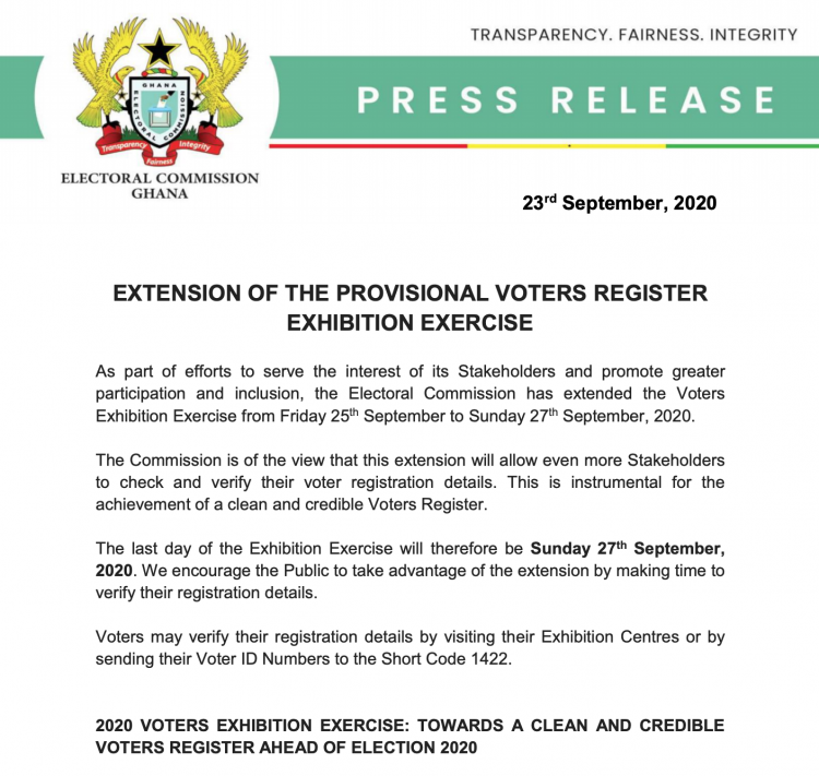 The Electoral Commission has extended the voter exhibition exercise from Friday, September 25 to Sunday, September 27, 2020.