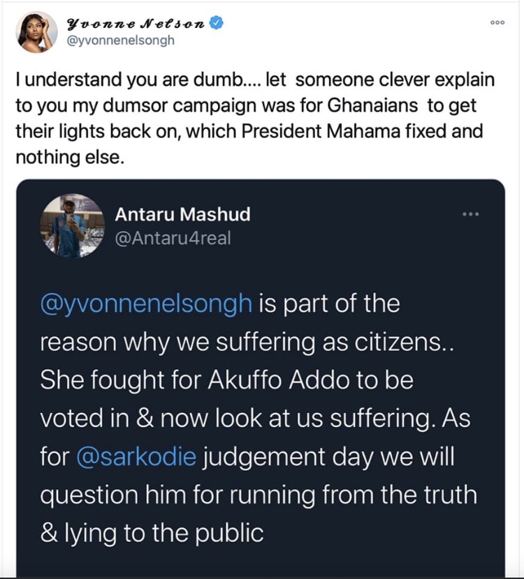 Antaru’s tweet seemed to suggest that the “Dumsor Vigil” held by Yvonne Nelson to protest the electricity situation in Ghana in 2016 under the NDC government aided in kicking them out and bringing in a new government (NPP) to solve the situation.