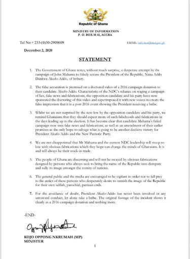 But a statement from the government signed by the Information Minister, Kojo Oppong Nkrumah indicated that “the government of Ghana noted without much surprise, a desperate attempt by the campaign of John Mahama to falsely accuse the President of the Republic, Nana Addo Dankwa Akufo-Addo of bribery”.