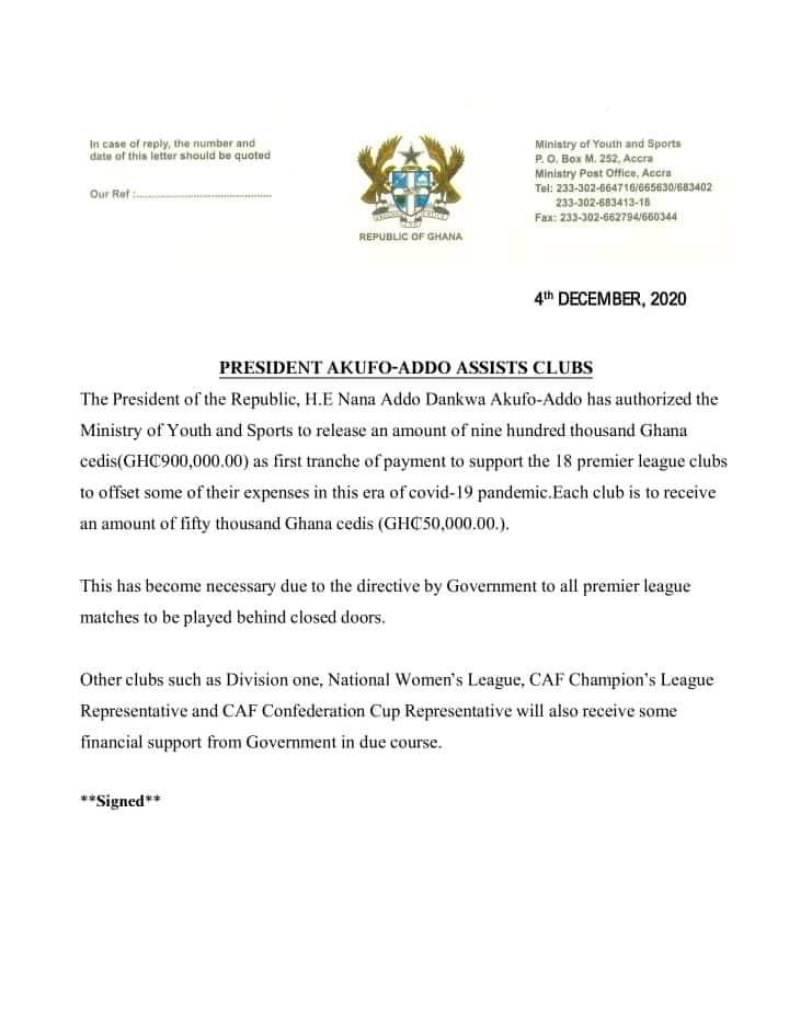“The President of the Republic, H.E. Nana Addo Dankwa Akufo-Addo has authorized the Ministry of Youth and Sports to release an amount of nine hundred thousand cedis (GH¢900,000) as a first tranche of payment to support the 19 Premier League clubs to offset some of their expenses in this era of COVID-19 pandemic. Each club is to receive an amount of fifty thousand Ghana cedis (GH¢ 50,000),” the statement said.