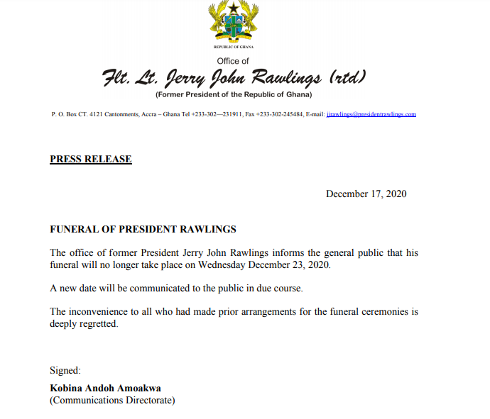 The funeral rites of the late former president, Jerry John Rawlings which was scheduled for Wednesday, December 23, 2020, has been postponed indefinitely.