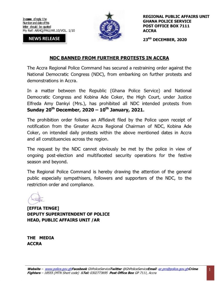 “In a matter between the Republic (Ghana Police Service) and National Democratic Congress and Kobina Ade Coker, the High Court, under Justice Elfreda Amy Dankyi (Mrs.), has prohibited all NDC intended protests from Sunday, December 20, 2020, to January 10, 2021,” the Police statement said.