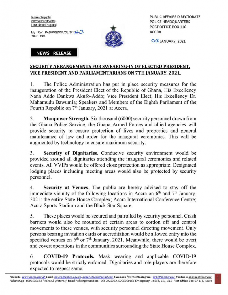“The Police administration has put in place security measures for the inauguration of the President-Elect of the Republic of Ghana, His Excellency Nana Addo Dankwa Akufo-Addo, Vice President-Elect, His Excellency Dr. Mahamamudu Bawumia; Speakers and Members of the Eighth Parliament of the Fourth Republic on 7th January 2021 at Accra.”