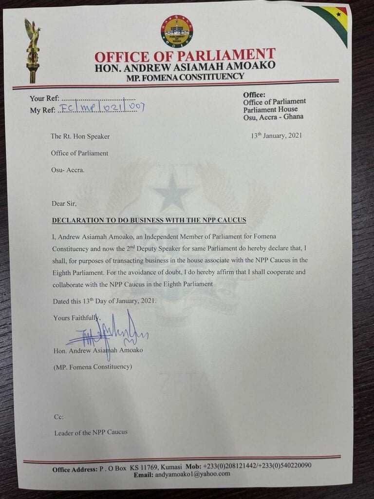 The Independent Member of Parliament for Fomena who is also the 2nd Deputy Speaker, Andrew Asiamah Amoako, has officially written to the Speaker of Parliament, Rt Hon. Alban Bagbin informing him about his decision to associate himself with the New Patriotic Party (NPP) caucus in Parliament.