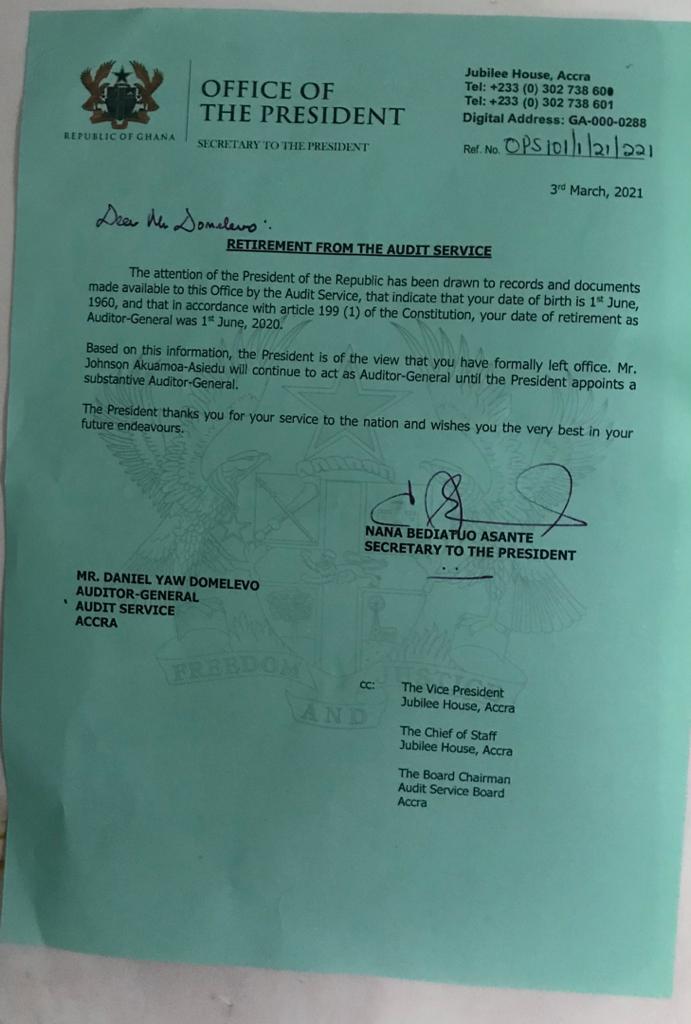 In a letter dated March 3, 2021, Nana Akufo-Addo, through his secretary, Nana Bediatuo Asante said, “The attention of the President of the Republic has been drawn to records and documents made available to this Office by the Audit Service, that indicate that your date of birth is 1st June 1960, and that in accordance with article 199 (1) of the Constitution, your date of retirement as Auditor-General was 1st June 2020.”