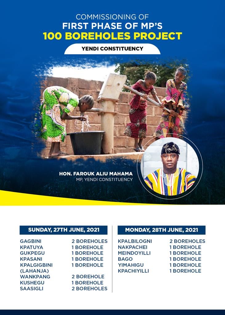 The Member of Parliament for Yendi, Alhaji Farouk Aliu Mahama, is set to commission the first phase of the 100 Boreholes Project and hand them over to the beneficiary communities.