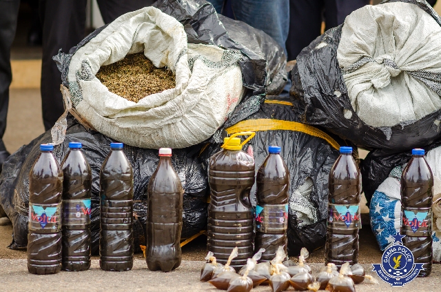 The items include seven sacks full of dried leaves suspected to be Indian hemp and 10 bottles of alcoholic drinks brewed with substance suspected to be Indian hemp.