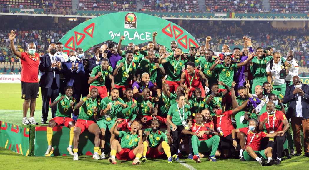 Soccer Football - Africa Cup of Nations - Third Place Playoff Match - Burkina Faso v Cameroon - Ahmadou Ahidjo Stadium, Yaounde, Cameroon - February 5, 2022 Cameroon celebrate on the podium after finishing in third place REUTERS/Thaier Al-Sudani