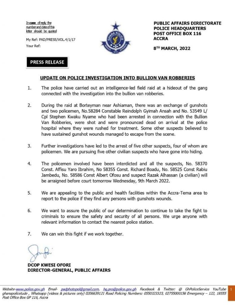 “During the raid at Borteyman, near Ashaiman, there was an exchange of gunshots and two policemen, No. 58284 Constable Reindolph Ansah and No. 53549 Lance Corporal Stephen Kwaku Name who had been arrested in connection with the Bullion Van Robberies, were shot and were pronounced dead on arrival at the Police Hospital where they were rushed for treatment. Some other suspects believed to have sustained gunshot wounds managed to escape the scene.”