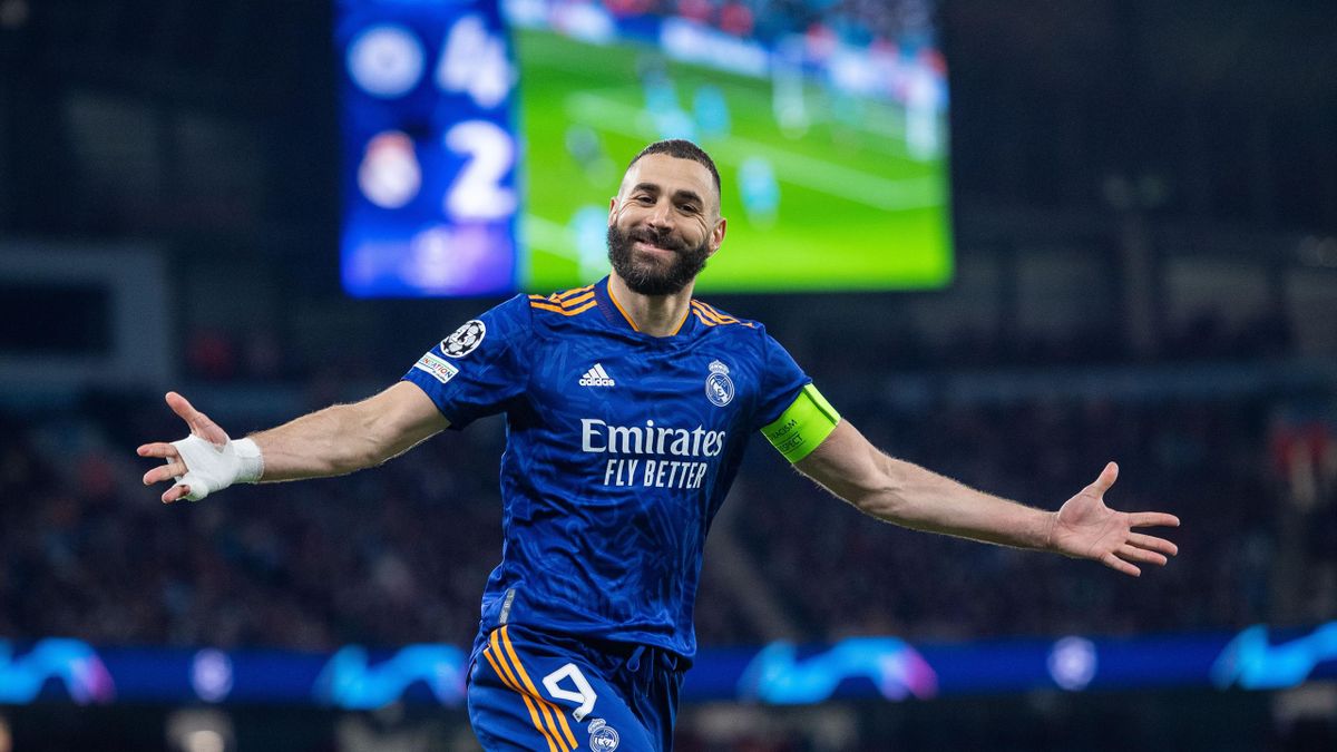 Benzema scored Real’s first goal at the Etihad before netting the third with a Panenka penalty.